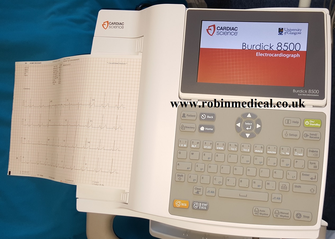 Burdick 8500 ECG / EKG recorder, with interpretations and 7″ colored LCD screen, in very good physical and operational condition, an actual photo for one of the units is displayed.