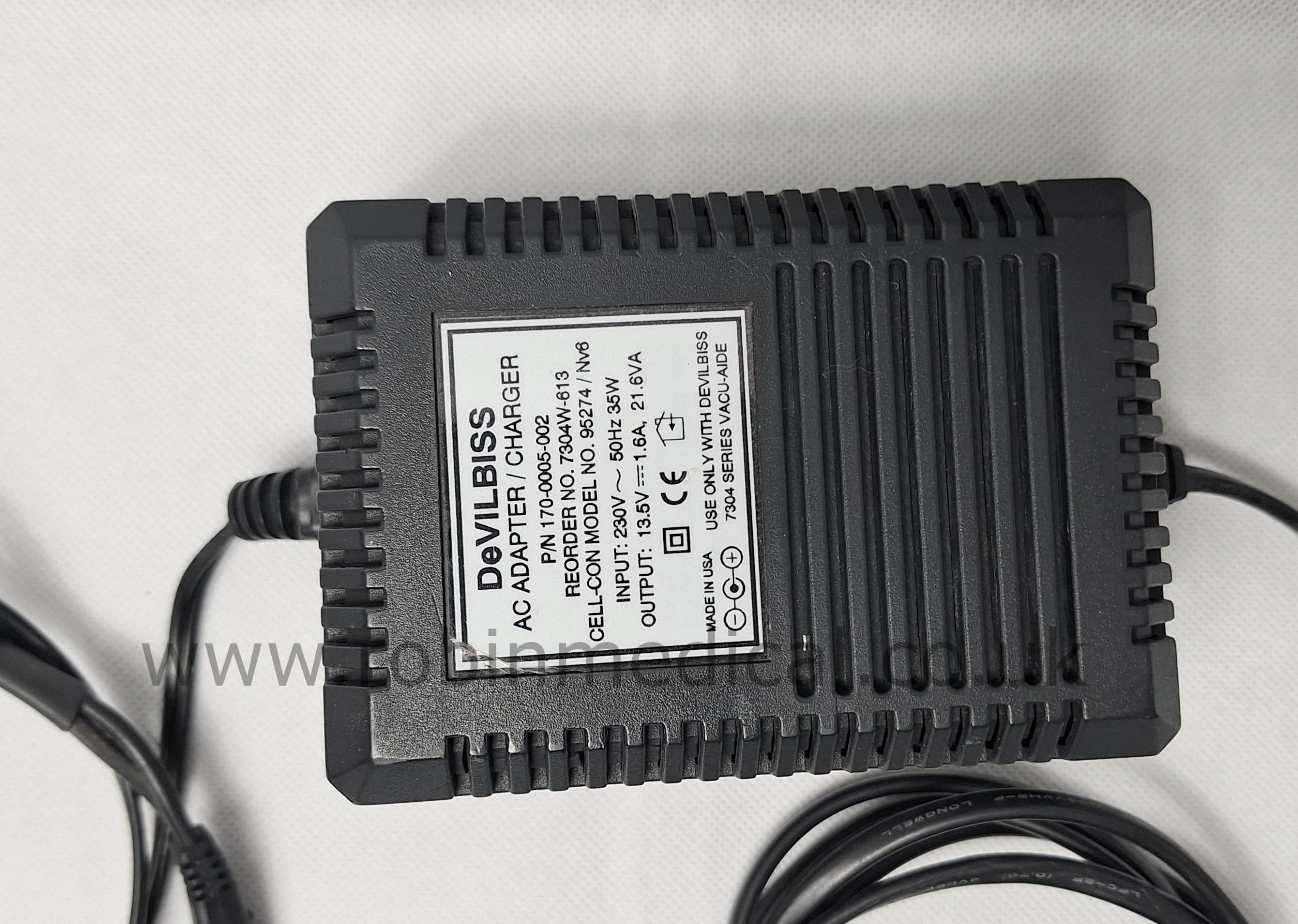 The DeVilbiss AC Adapter Charger (REF: 170-0005-002) is a reliable power supply designed for use with compatible DeVilbiss medical devices. Built to meet strict medical safety standards, it provides consistent and stable power delivery for optimal device performance. Compact and lightweight, this adapter is suitable for both clinical environments and homecare use.