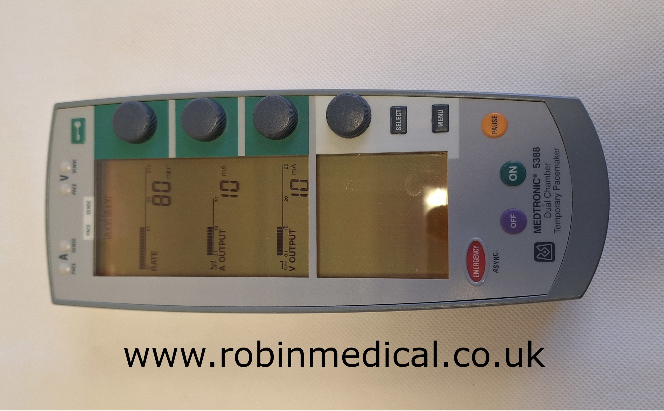 The Medtronic 5388 is a dual-chamber temporary external pacemaker designed for hospital and clinical use. Engineered to provide temporary atrial and ventricular pacing, this advanced device supports both adult and pediatric patients. The 5388 offers intuitive controls, enhanced programmability, and a clear LCD interface, allowing clinicians to deliver precise pacing therapy during acute or post-operative cardiac care.
