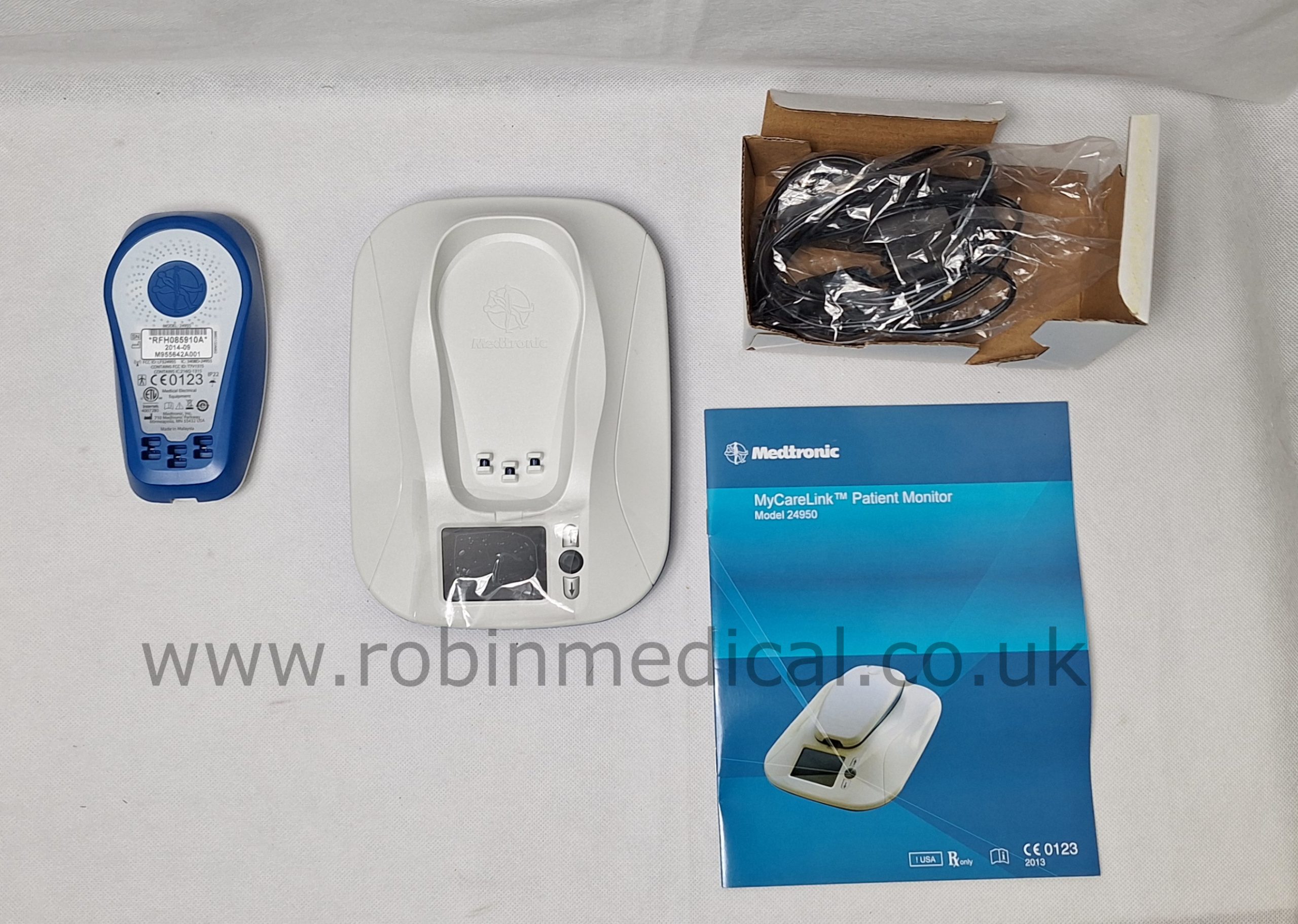 The Medtronic MyCareLink Patient Monitor (REF 24950) is a home-based remote monitoring device designed to interface with compatible Medtronic implantable cardiac devices. It wirelessly collects data from the implanted device and transmits it to the clinic via cellular networks, enabling physicians to review device performance and patient cardiac status between visits.