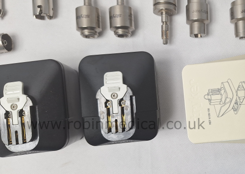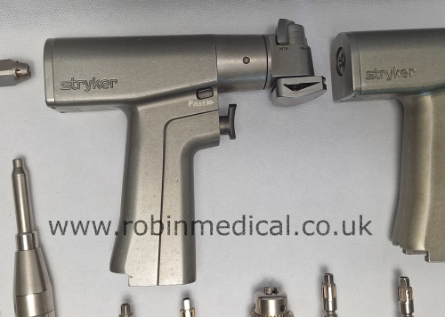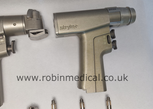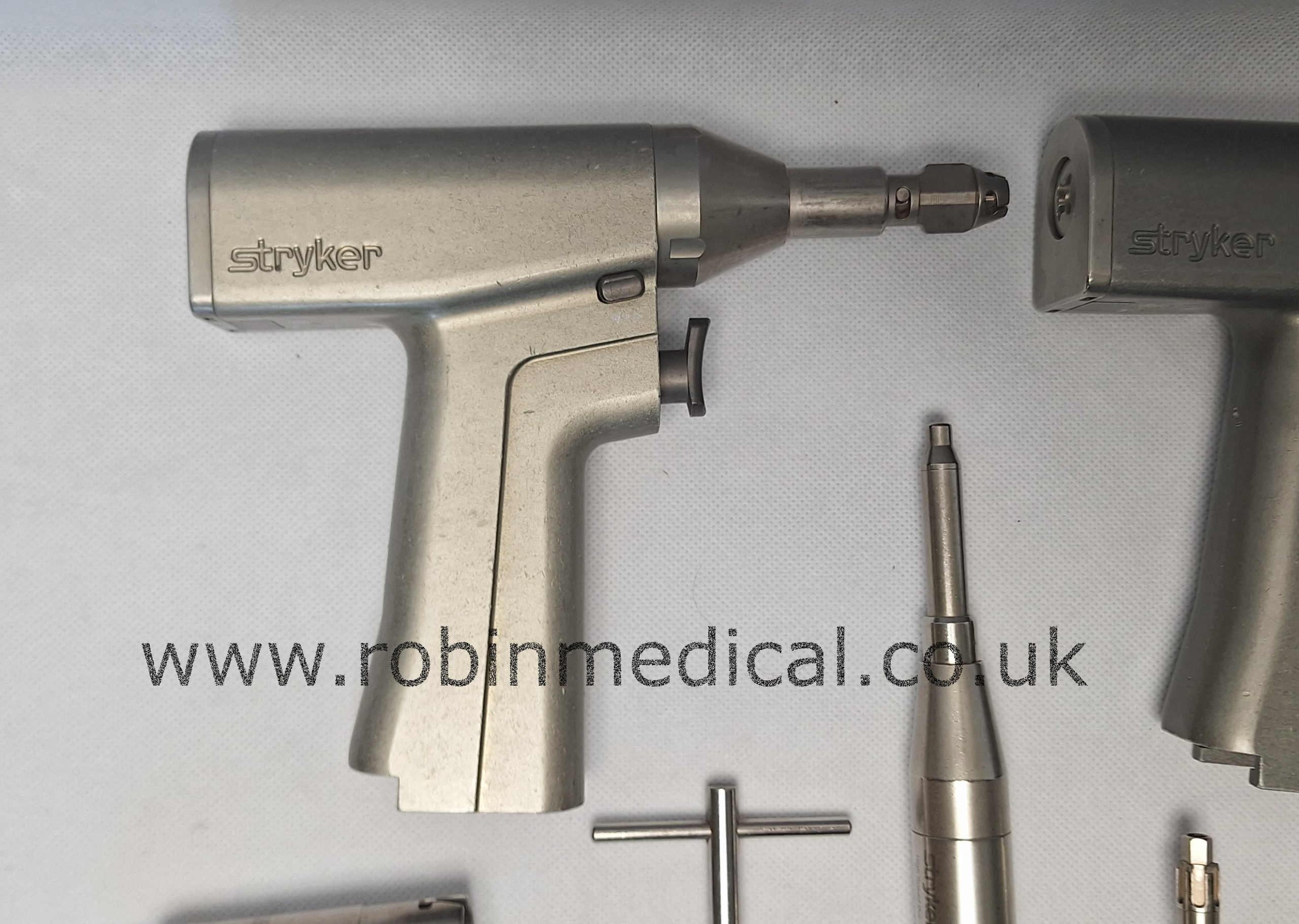 The Stryker System 6 Large Bone electric power tool set, is a comprehensive surgical power tool system designed for high-performance use in large bone orthopaedic procedures such as trauma, joint reconstruction, and spine surgery. The set includes a versatile handpiece, multiple attachments for a range of functions, and batteries for cordless operation. The system is known for its advanced motor technology, which provides exceptional power, control, and reduced vibration, allowing surgeons to perform tasks like drilling, reaming, sawing, and pinning with precision.